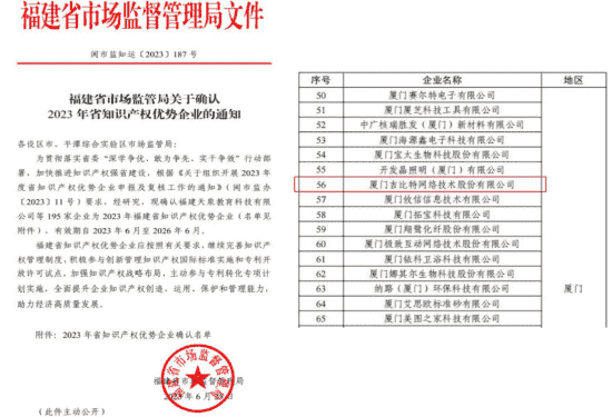 近日,,,福建省市场监督管理局公示了2023年福建省知识产权优势企业名单,,,,厦门1win网络技术股份有限公司(以下简称“1win”或“公司”)榜上有名。。。。